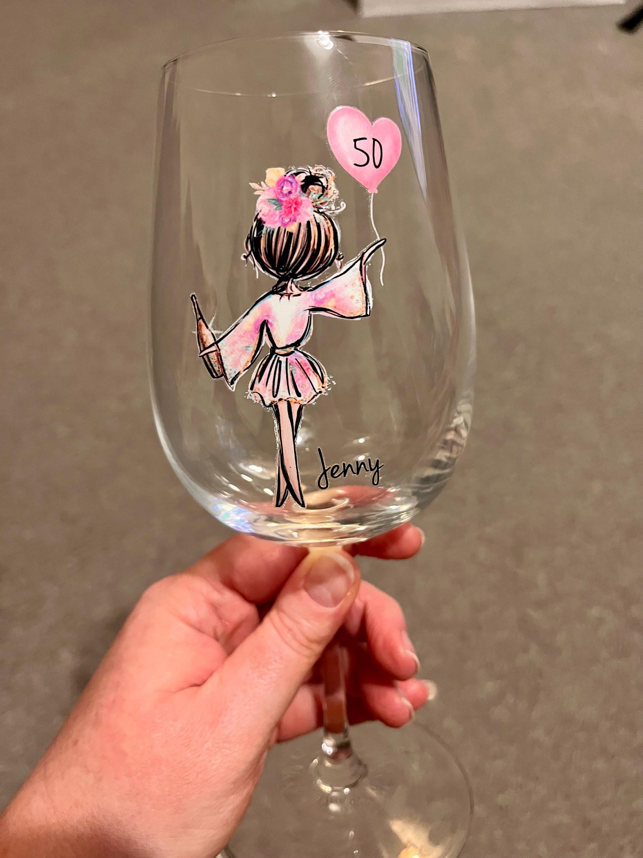 Celebrate a special birthday in style with this beautiful personalised wine glass, featuring a chic illustrated lady holding a drink, customised just for her! 💕