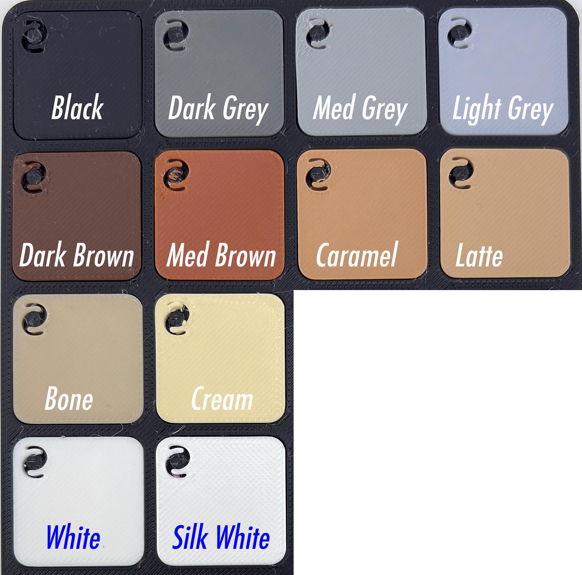 Nametags are printed with PLA (Polylactic Acid), a durable environmentally friendly plastic that is made using a sustainable process from renewable resources. They are printed with 100% infill (solid) and sprayed with a UV resistant protective clearcoat; even so, please know that they are plastic and therefore they may warp in hot sun/high temperatures. We recommend they not be left in a hot car.