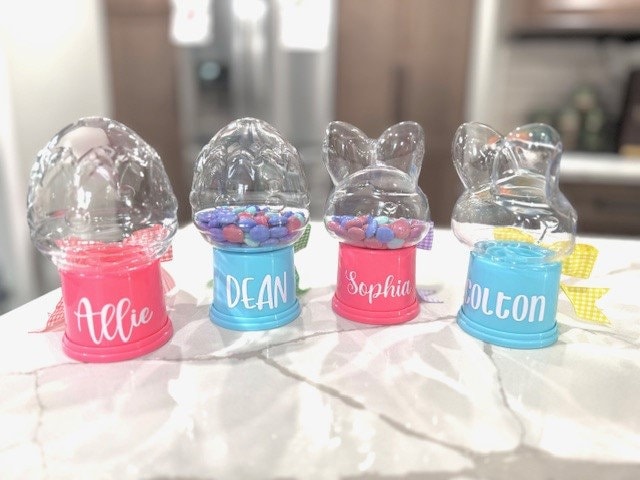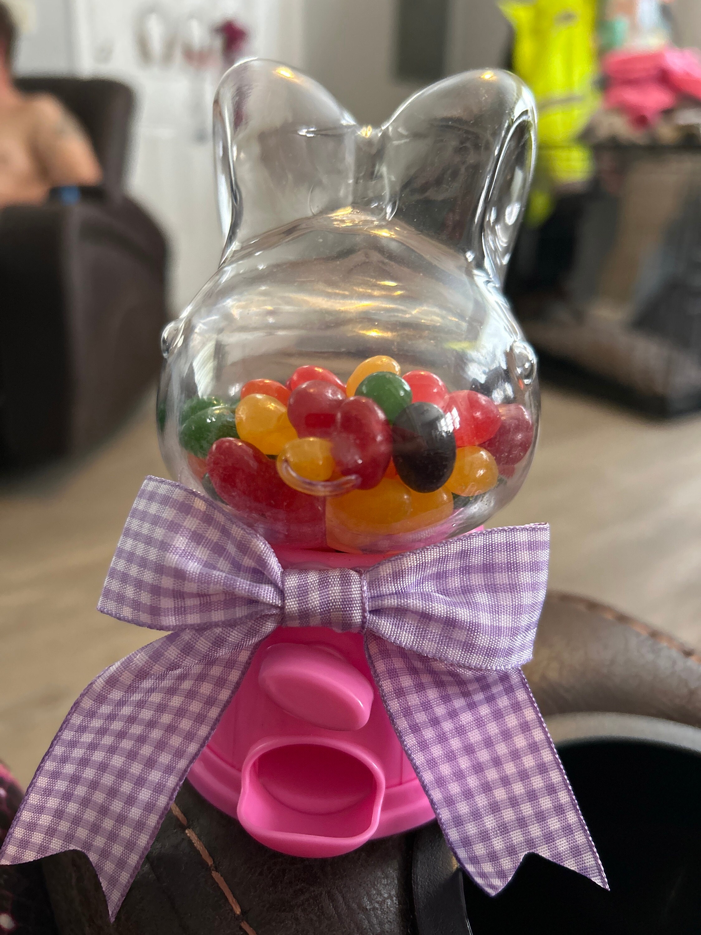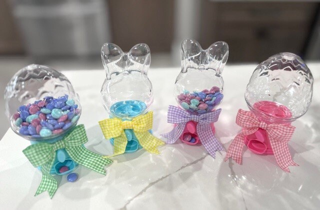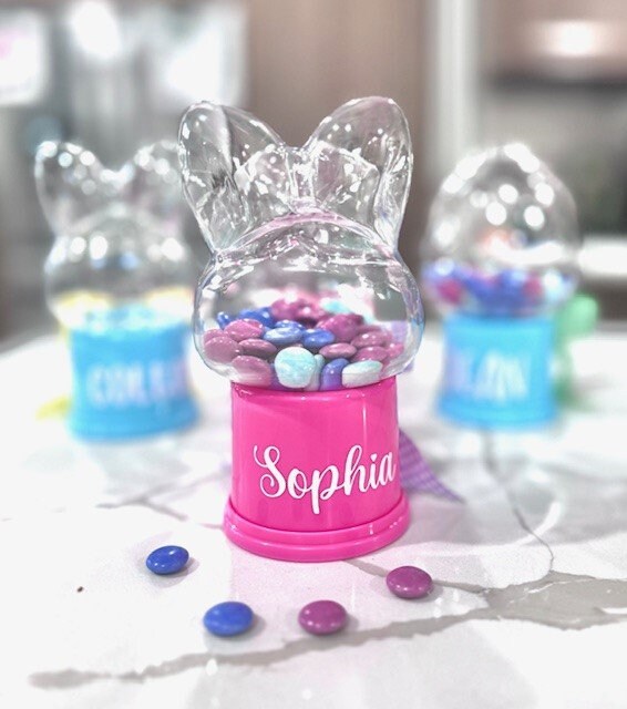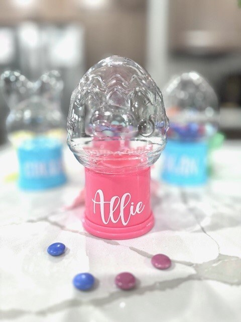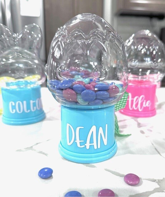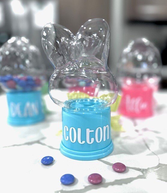 Fillable Easter Bunny or Egg Candy Dispenser. Can choose base and bow colors. Great gift for your children, classmates, teachers, coworkers, etc. Measures 5.875" X 3.5" X 3.375".