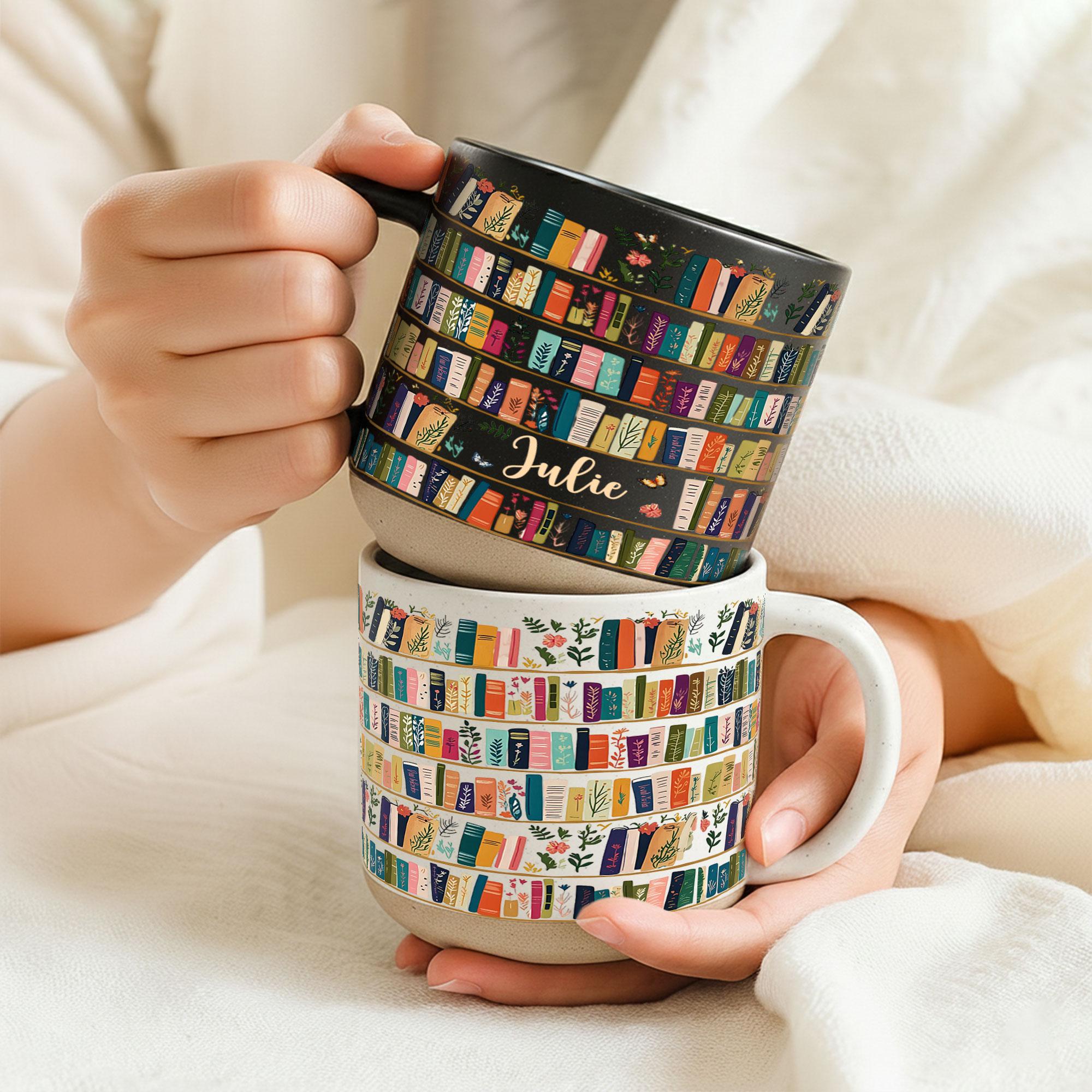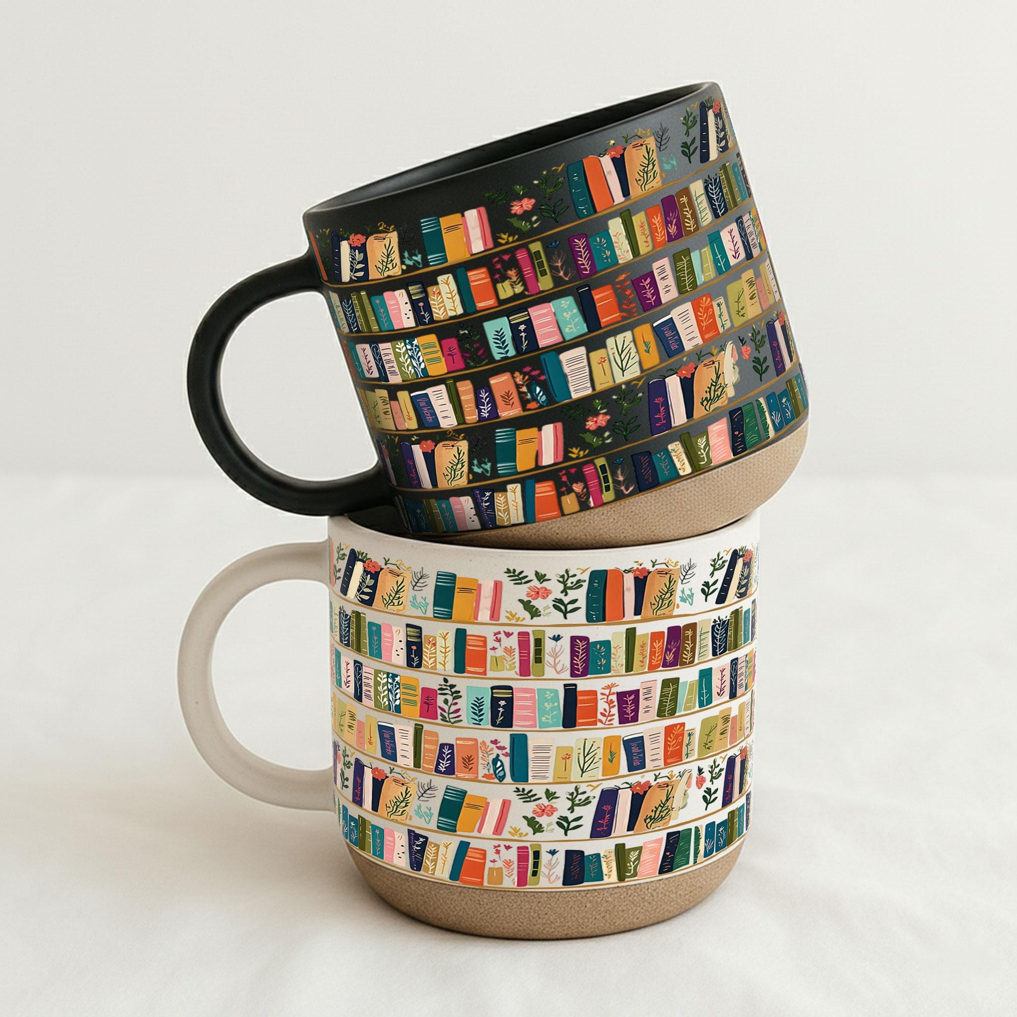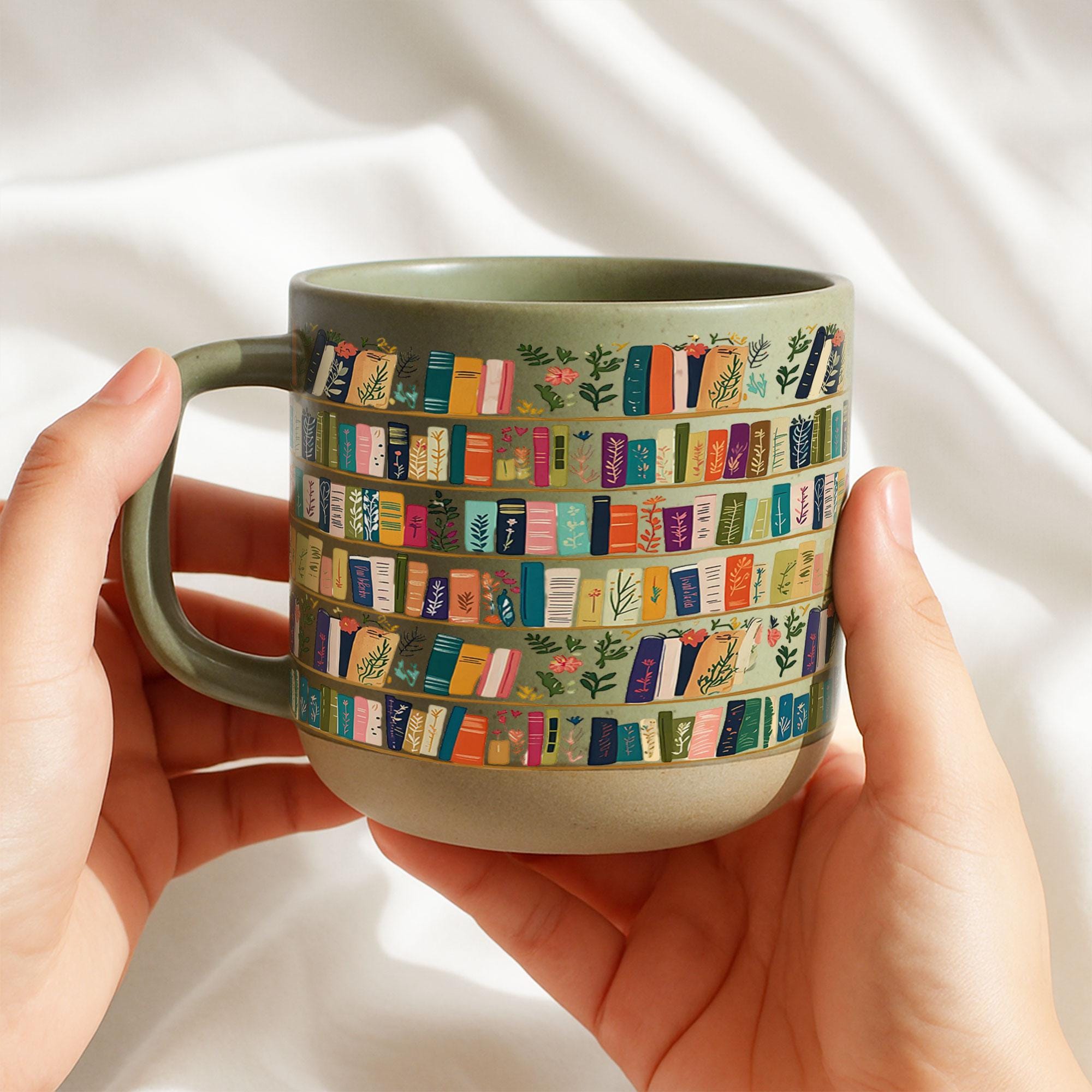 Vintage Bookshelf Library Pottery Mug Book Lover Gift, Floral Bookish Gifts For Reader, Reading Coffee Cup, Teacher Gift, Book Club Gift